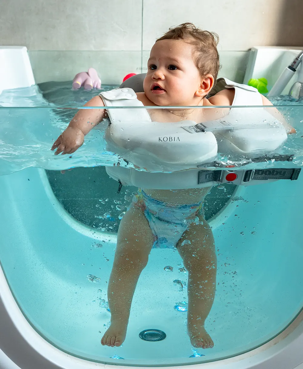 L’hydrothérapie permet au corps de bébé de s’exprimer et de se détendre grâce à la poussée d’Archimède qui permet dans l’eau de n’avoir aucune attraction terrestre.