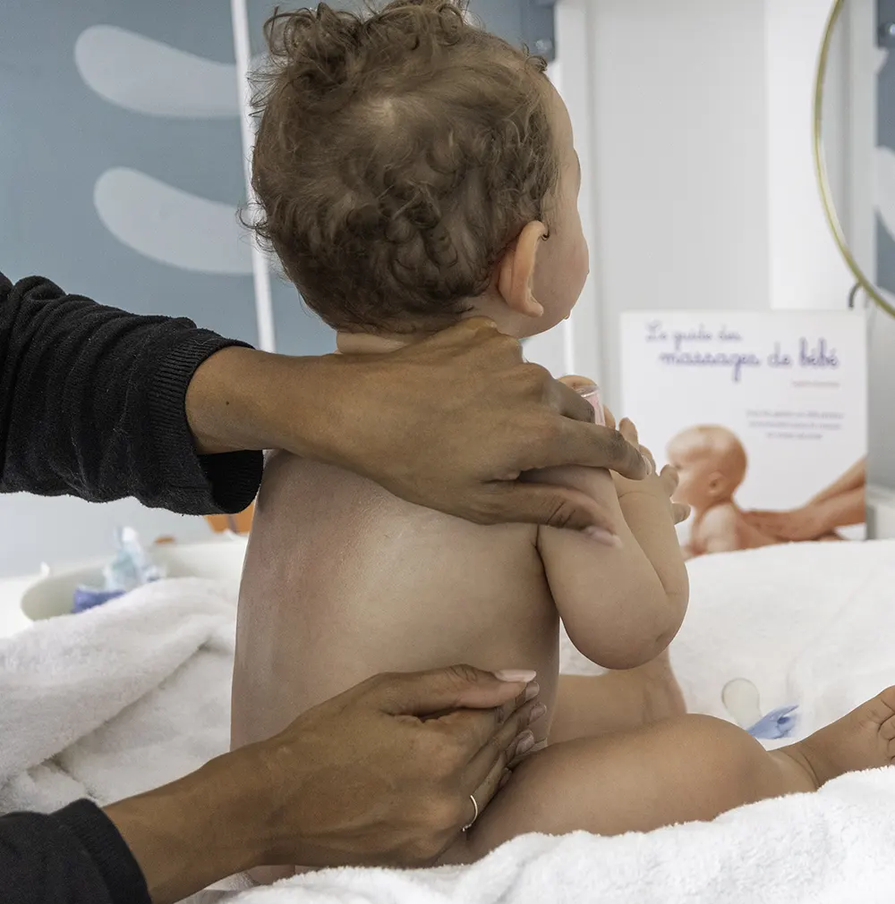 Vous pourrez ensuite prendre le temps de masser votre bébé à l’aide de l’huile spécifique mise à disposition, accompagné(e) de supports photos pour vous initier au massage.